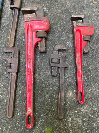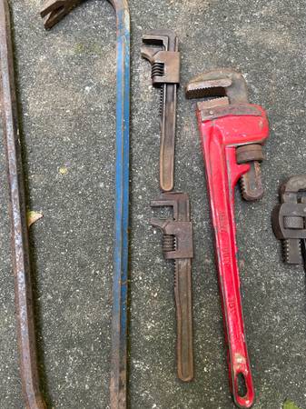 Miscellaneous pipe wrenches and crowbars, everything’s in the picture. $40 Please email or leave your phone number Will delete when sold Thanks