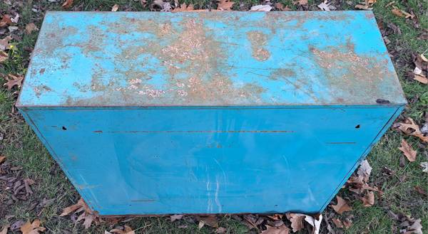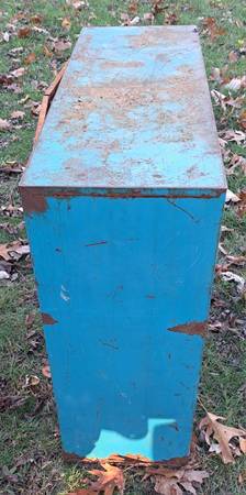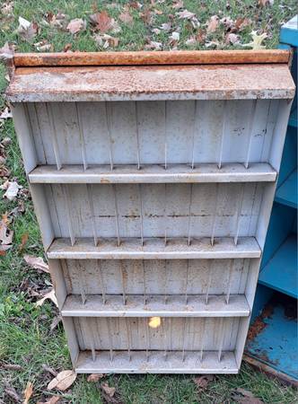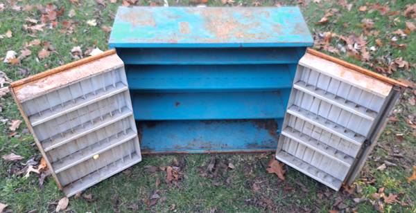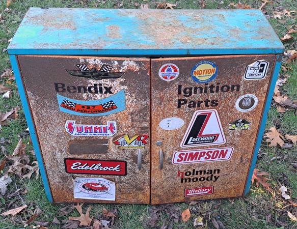 Parts cabinet with shop patina and classic stickers. Refinish or use as is. 4 shelves plus an additional 36 storage compartments in each door. Key cylinder with missing key replaced with similar 1/4...