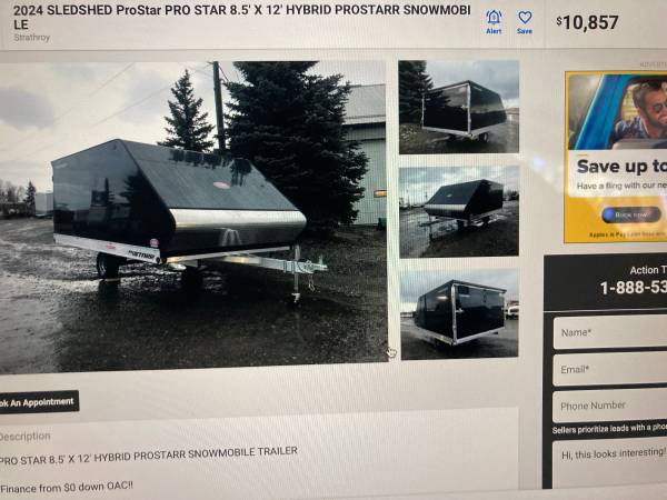2023 PRO STAR ENCLOSED ALUMINUM ENCLOSED SNOWMOBILE TRAILER,BARELY USED,TIRES STILL HAVE NUBS ,MEASURES 101 INCHES WIDE,155 INCHES FRON NOSE TO REAR ,SIDE DOOR ,RAMP,EXCELLENT CONDITION,COST 10500.00 NEW ,PLUS 630.00 TAX ,PLUS PREP CHARGE,SAVE OVER 4000.00 COMPARED TO NEW,CALL OR TEXT SCOTT AT show contact info