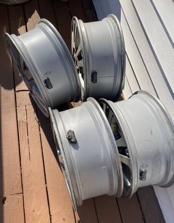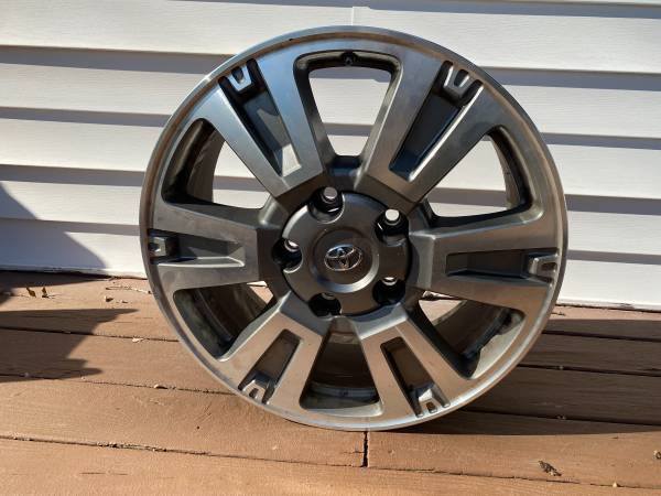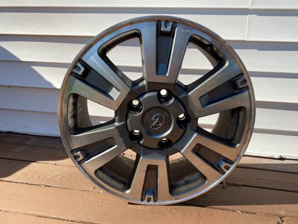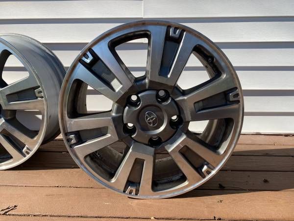 Full set of 5-lug, 20" OEM wheels from a 2014 Toyota Tundra. The wheels were on the truck for 5 years. Each wheel includes the tire pressure sensor (TPS) and lug nuts. The wheels have very little wear and a separate photo is included for each one.