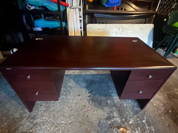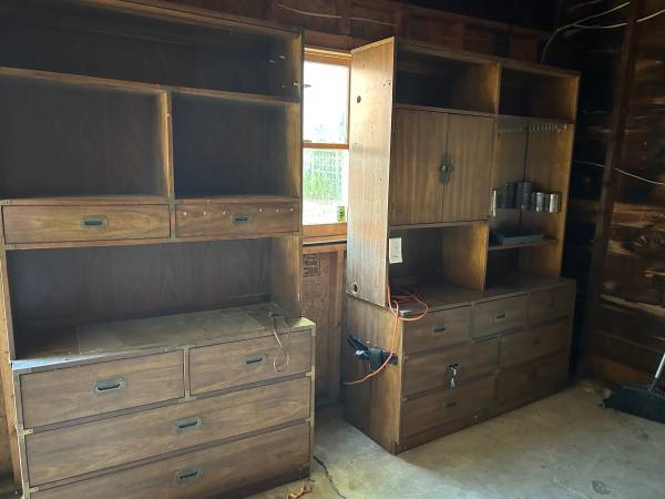 Free stuff at curb - large wooden storage units, used in garage, dresser used in garage, nice office desk.