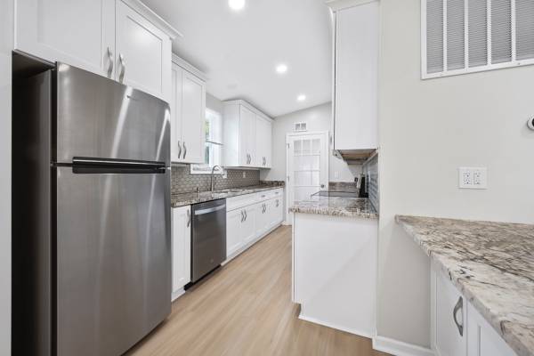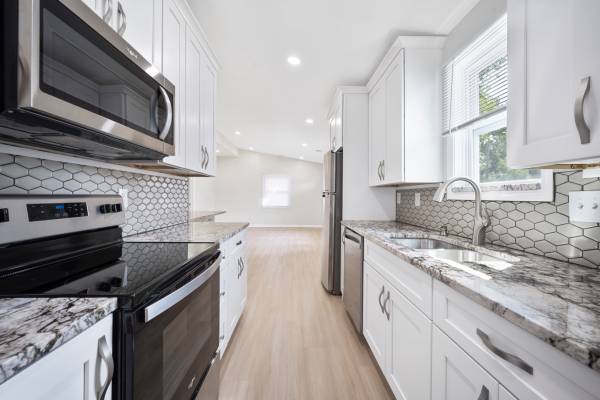 -Modern kitchen with stainless steel appliances & stylish backsplash