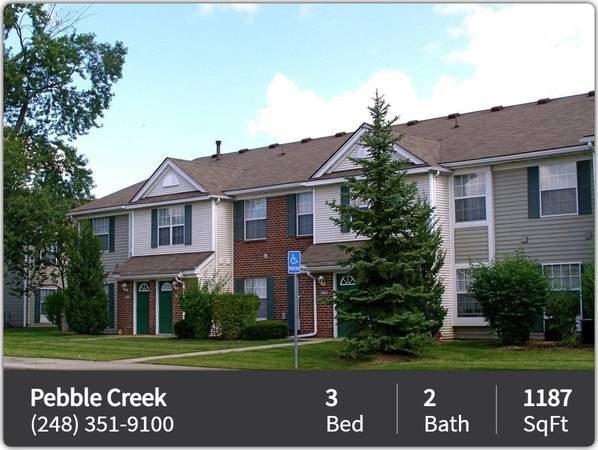 All of the home without the hassle! Conveniently located in Southfield, Michigan, Pebble Creek Apartments provides easy access to Northwestern Highway, Interstate 696, Lodge Freeway and is just minutes to Oakland Community College, Detroit Zoo and Applegate Square Shopping Center. These affordable Southfield apartments include an array of amenities such as a 24-hour fitness studio, sparkling swimming pool with free Wi-Fi access. Further conveniences include 24/7 online rent payment and planned resident activities.