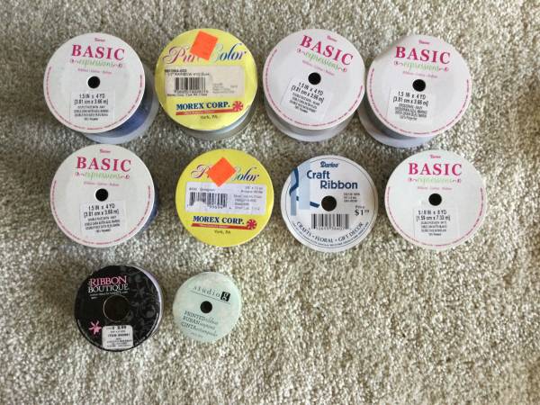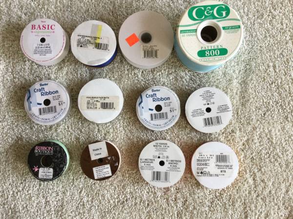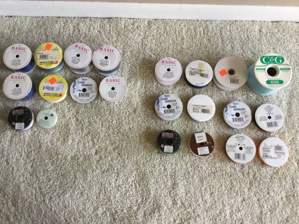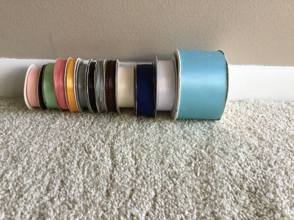 New and used ribbon. There are 10 spools of brand new ribbon and 12 spools of barely used ribbon for a total of 22 spools. Various widths and colors. Satin, polyester, nylon, etc.