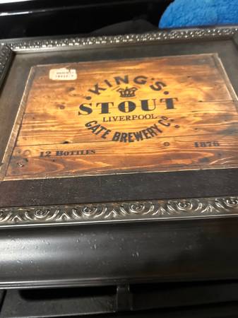 -Two-sided metal sign for Sam Adams Light beer. -Framed print of a vintage wooden crate for "King's Stout" from the Gate Brewery Co. in Liverpool, dated 1876. -