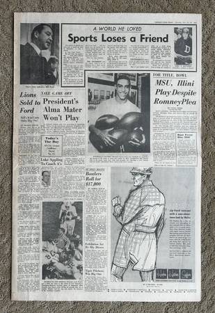In Section C, Sports, there’s a front page article “Sports Loses a Friend,” regarding the President’s death. Also on the front Sports page is an article announcing that Bill Ford will be the new owner of the Lions. Also, there’s a photo of M.S.U.’s Sherman Lewis holding four footballs.