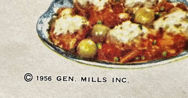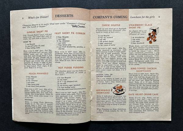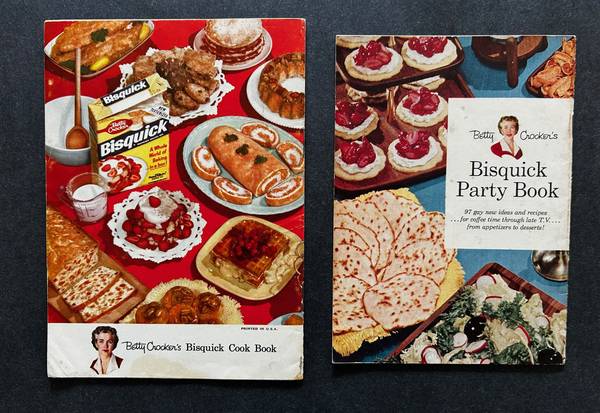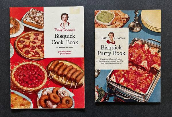 The portable cookbook was so popular that in 1957, General Mills put out “Betty Crocker’s Bisquick Party Book” that was also 26 pages, slightly smaller (4 3/4 x 6 3/4 inches), with “97 gay new recipes for coffee time through late T.V.”