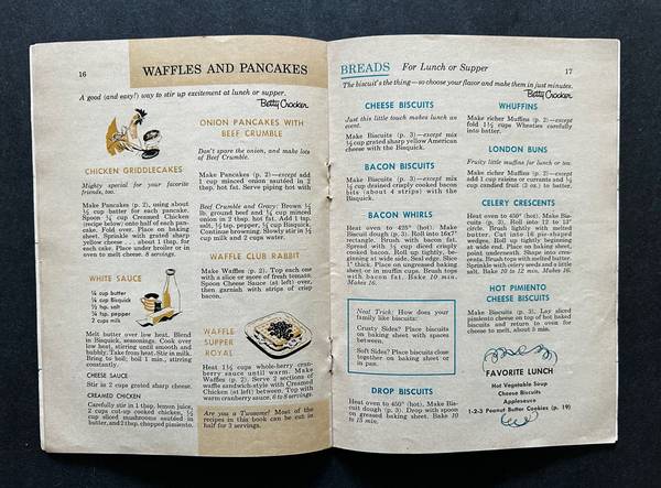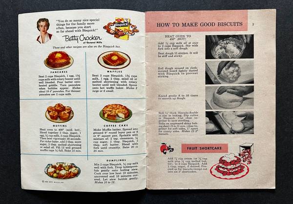 The company created a smaller sized “Betty Crocker’s Bisquick Cook Book” which would be easy to store. It included 26 pages of 157 recipes that used Bisquick. It measures 5 1/2 x 7 1/2 inches.