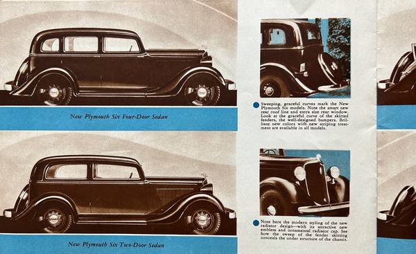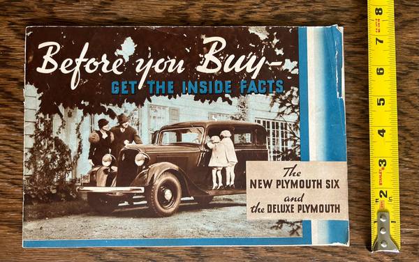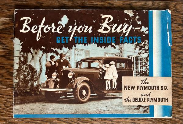 This 22 page sales brochure advertises the New Plymouth Six and the Deluxe Plymouth, both with a whopping 77 hp engine. I’m guessing these two models didn’t make any speed records, especially with nearly all steel construction.