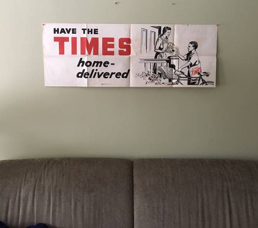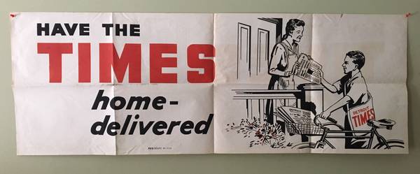 This banner is huge (slightly over 4 feet wide x 1 1/2 feet tall) and was probably placed in a large window to advertise home delivery of The Detroit Times. The Times began in Detroit in 1900 and finally went out of business in 1960.