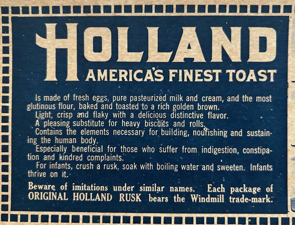 The Holland Rusk Co. began in the late 1800s in Holland, MI. Rusk is a dry and crunchy round biscuit—basically twice-baked bread. It’s used in a lot of recipes and as a type of toast. In the Netherlands, rusk is used as a breakfast food, something like toast. It’s also used as a type of shortcake base.