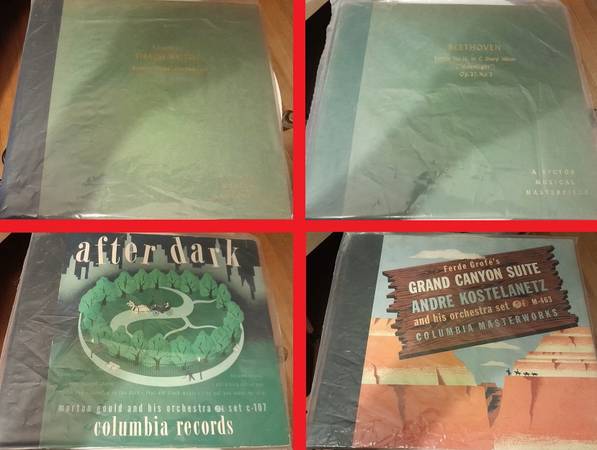 All the records them selves are in VG to NM condition. Most of these records look to have been played only a few times if not at all. No visible gray groove ware from heavy tracking steel needles. The jackets show their age and have scuffs, splits and signs of ware from storage and movement. A few of them were sealed in thick plastic for storage and look pretty good (please see pictures). Offers will be considered. Due to the age of these items and their end use being out of my control, they will be sold as-is.