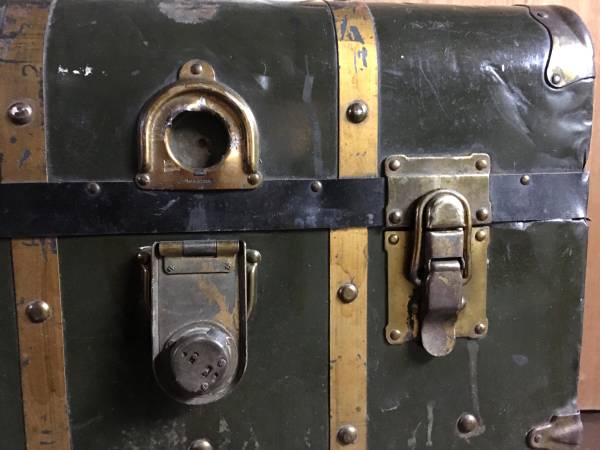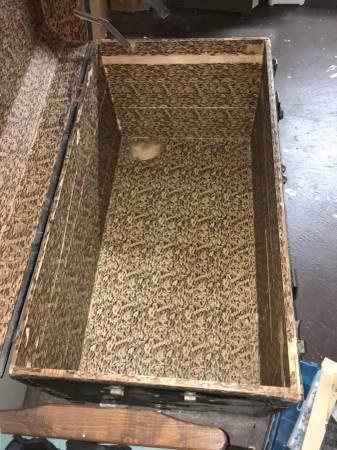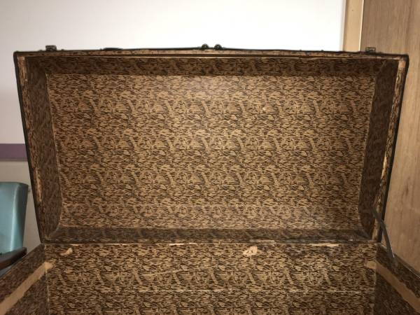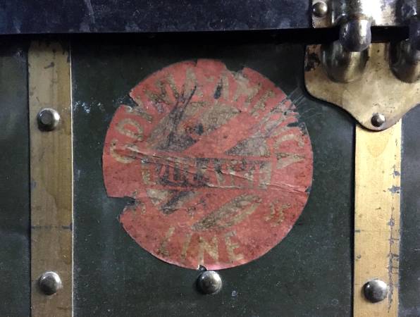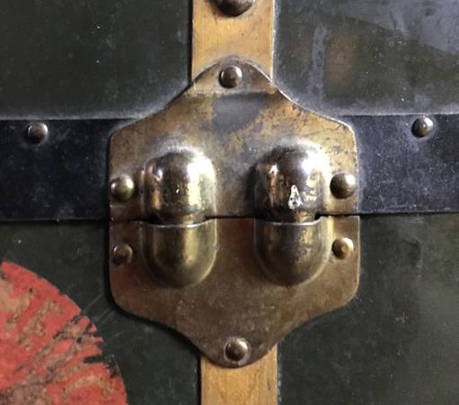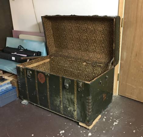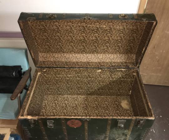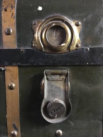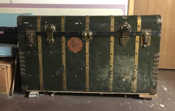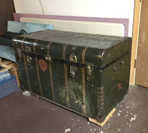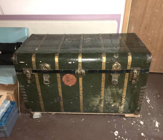 HUGE Antique Metal Steamer Trunk From The Polish "Gdynia-America Line" - This antique wardrobe trunk was brought over from Poland by my Grandparents. It has the remains of a sticker on the front that says it came over on the Polish "Gdynia-America Line" and the ship name was "Pulaski". The trunk has a curved top, paper lining and is solid and sturdy. It closes on the front with two latches and two locks. Other than the obvious dings and scratches, the only flaw to really note is damage to the Excelsior locks. I never had a key and despite being told not to mess with them because of this, the neighbor boy liked to closed them up, which meant I had to pry them open. The trunk is approximately 24" x 44" x 26". Huge and plenty of room for LOTS of stuff. $150