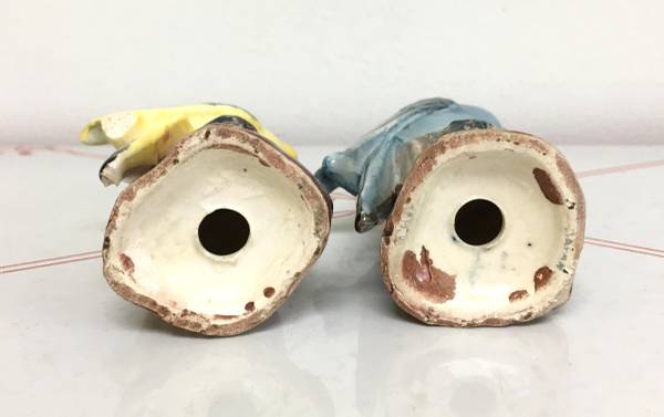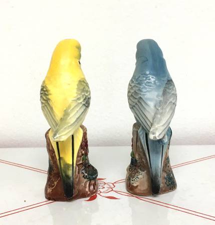 Vintage "Blue & Yellow Birds on Stumps" Salt and Pepper Shaker Set - This set is in excellent condition. Does not include corks. They are approximately 4.5" tall. No maker mark on the bottoms. The only flaw I notice is that the tip of one of the yellow bird's wings has broken off. Made of Ceramic. $8