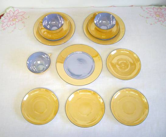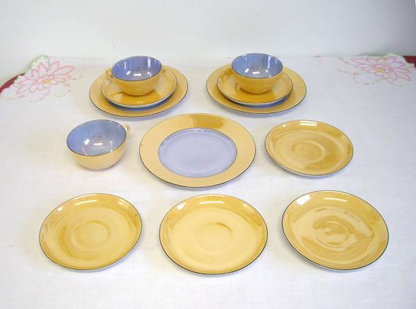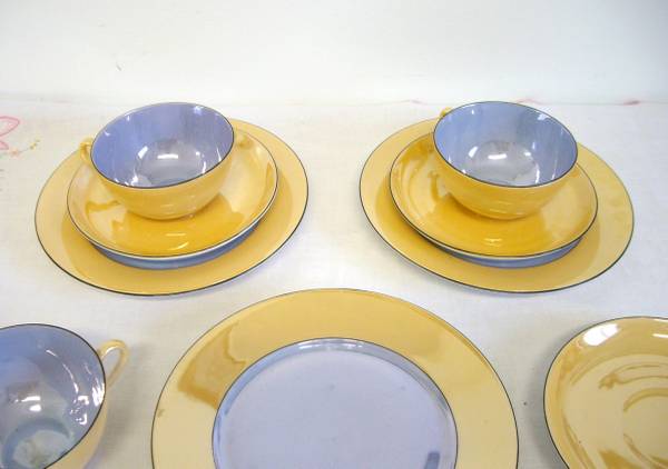 A beautiful set of peach and blue lusterware by Zeh Scherzer Bavaria. Includes a set of three cups/saucers/dessert plates and three extra saucers. In a beautiful peach/blue colorway. The colors are a tad darker than my photos show. The close-up of the plate and saucer show the color best. Going by the maker's mark, these were produced between 1930-1945. $10 for the set.