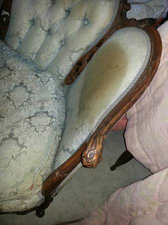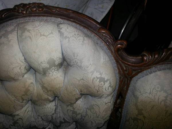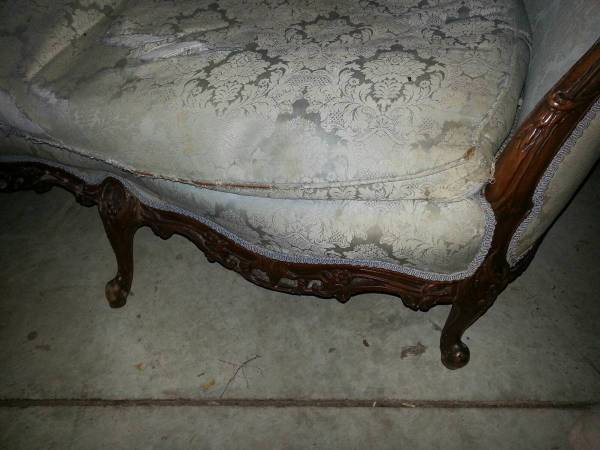 Antique French Provincial sofa for sale in fair condition. Ornate carved wood frame. Needs reupholstery and frame repair. This is an authentic piece -- not a reproduction/replica.