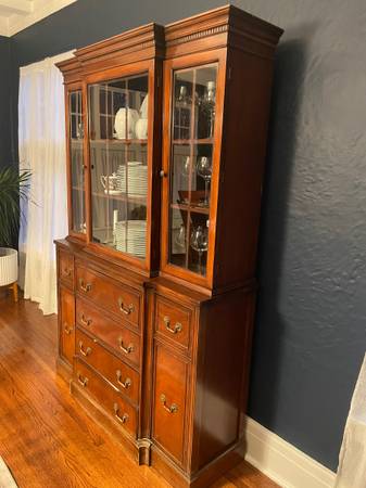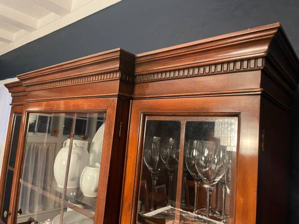 Cherry china cabinet. In good shape, except some damage at the base - see last photo. 50” wide 75” tall 16” deep Pick up only.