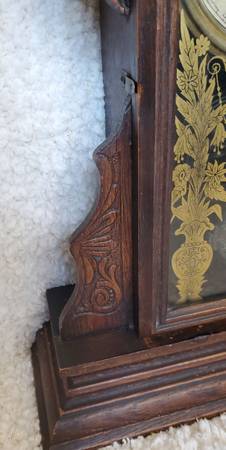 ANTIQUE AMERICAN GILBERT "CAPITAL NO.44" MODEL FINE OAK PARLOR CLOCK. CIRCA 1904. 8DAY TIME AND STRIKE SIGNED GILBERT MOVEMENT. THE CLOCK STRIKES THE HALF HOUR AND COUNTS THE HOURS ON A COILED GONG. THE DIAL IS SIGNED GILBERT. THE CAST PENDULUM IS EXTRA FANCY. THERE IS A FULL LABEL ON THE BACK OF THE CASE FOR CAPITAL 44. THE DOOR GLASS IS REVERSE PAINTED. THIS CLOCK IS LISTED IN TRAN DU LY'S GILBERT BOOK ON PAGE 345. THE PRICE LIST VALUE IS $225.