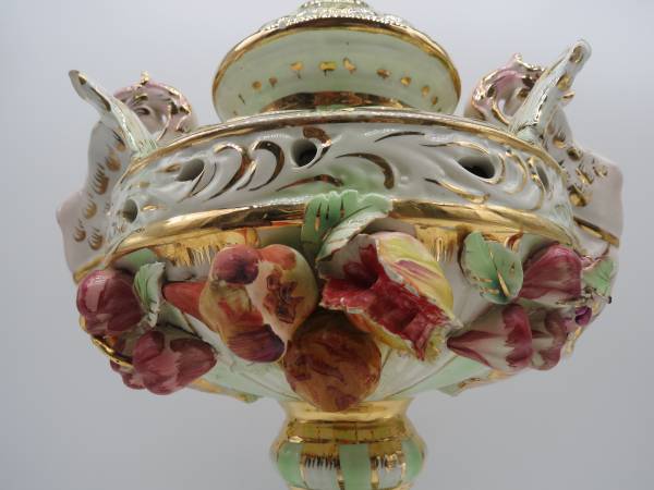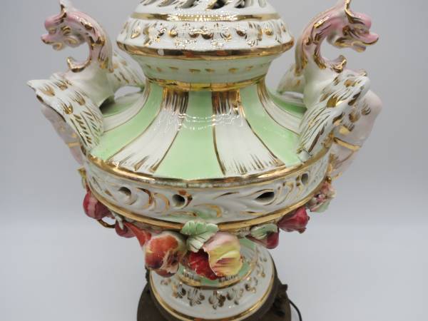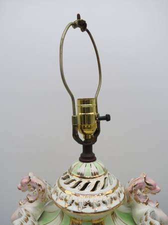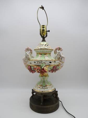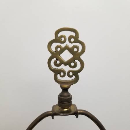 This lamp has been rewired and has a new socket and is in excellent working condition. There is one tiny 1/8" diameter chip to the back side of the lamp. The brass platform has heavy patina and has not been cleaned and polished. The photos were taken without the finial which is shown in a separate photo.