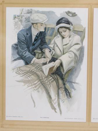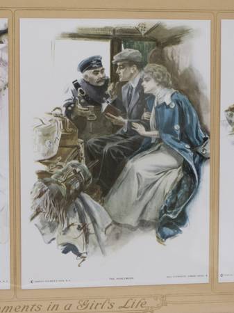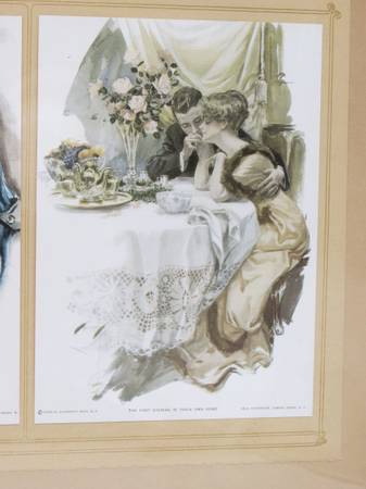 Enjoy the charming allure of yesteryear with this Antique Harrison Fisher Victorian 4 Stages of Love Framed Print. This piece is a tasteful addition to any room, infusing it with the romantic vibes of a bygone era. The print is elegantly presented within an antique frame that complements its vintage aesthetic. The prints and background are in fabulous condition. The antique frame has chips along the left size which could be hidden a touch of gold paint.