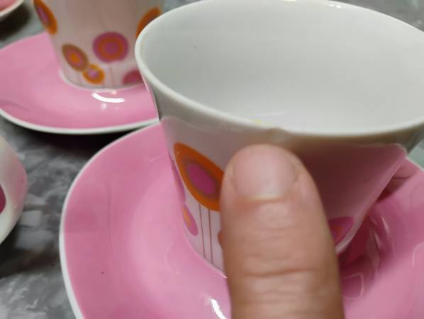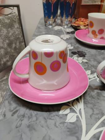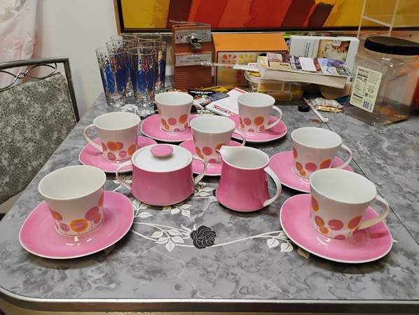 Retro 16 Piece Studio International Tea Set 7 cups, 7 saucers, 1 sugar bowl with lid, 1 creamer, 3 inch high, 6 inch diameter We don't text any numbers use any codes accept checks give out our...