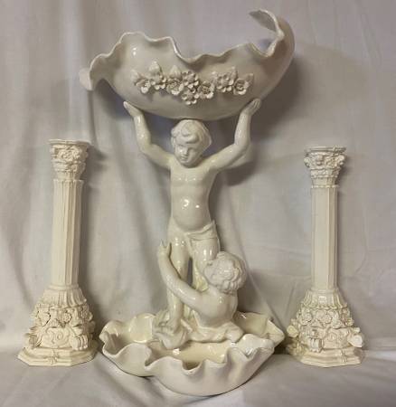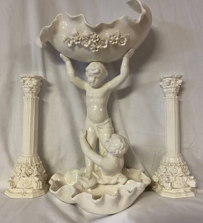 White Lenwile Ardalt Artware Japan TwoTier Cherub and Floral Bowl (17”) and pair of 10” Column Candlestick Holders.