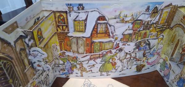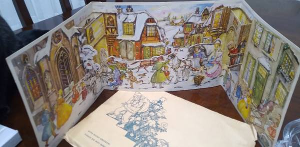 CHRISTMAS TOWN DISPLAY CARD. Windows open to see inside the homes.