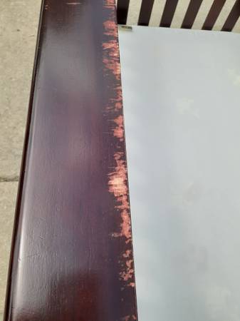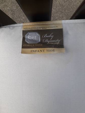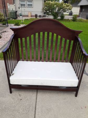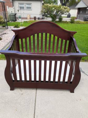 Solid cherry wood. Converts into toddler bed. Teething marks on front and side panels. Front and back panels can be used as headboard and footboard for full size bed. Best quality mattress, Stearns & Foster. Crib and mattress belonged to Grandma and Grandpa for visits, so it was hardly used.