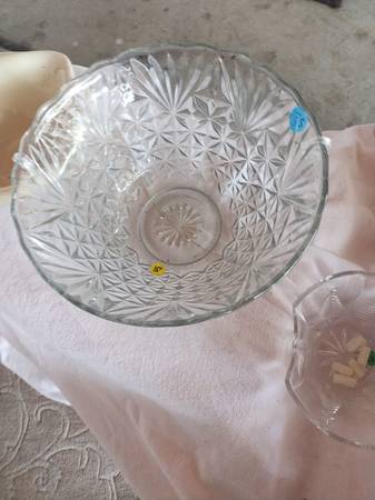 Punch bowls $5 they're Crystal Christmas glasses and mugs I have four dollar each also I have tall glass Christmas for wine dollar each I also have six of dessert for $5 or a dollar each I have vintage bowl off-white for $3 all the other crystals as you see in the picture some are $5 and some are higher in a dessert tray with the crystal ball $6 cash only all set in the garage with my sale Cash and Carry dealers are welcome may buy all of them at a great price thank you