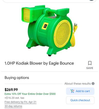 Hi, We have various commercial bounce house blowers for sale. They all work... Just don't need anymore. 1hp $99 (firm). 1.5 hp $150 (firm) 2 hp $175 (firm) If interested, contact us at...