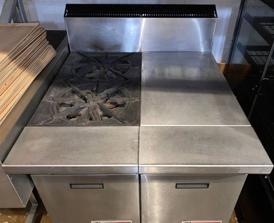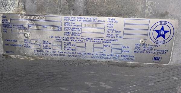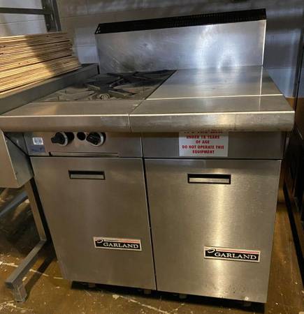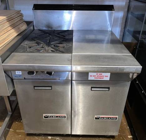The Garland 2 Burner Range Attachment Model M4S is a commercial cooking equipment designed for restaurant and food service businesses. It has a 35,000 BTU output and a side prep storage base. The brand is Garland and it was manufactured in the United States. It is a non-customized and non-modified product.