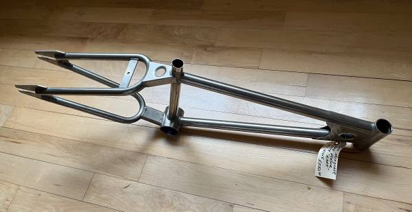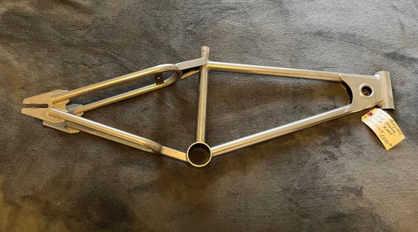 BMX Mongoose Team bicycle frame. Sold in California. Original nickel plating and remnants of candy blue still showing. Rare team model manufactured in 1979. Measures 18 1/2” from center of the seat tube to the center of the head tube and 11 1/2” from the center of the crank to the top of the seat tube. These particular Mongoose BMX frames are drying up and increasing in price ever since the Covid shutdown. Get it now while you still can.