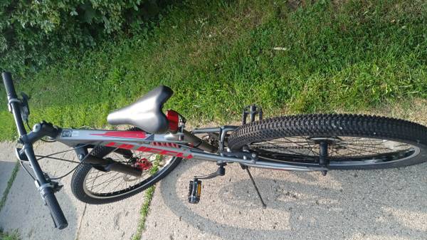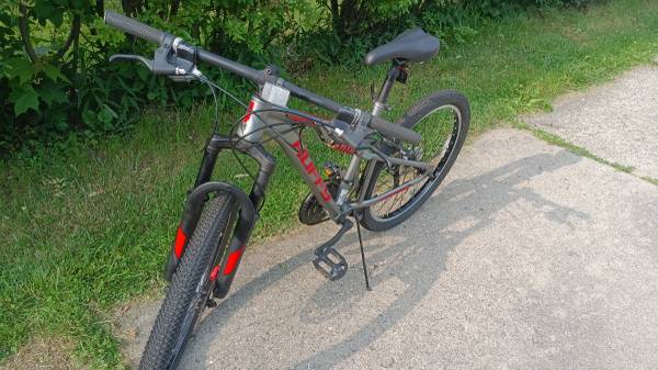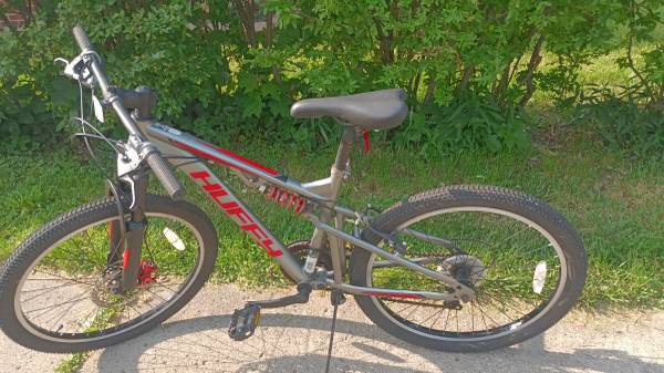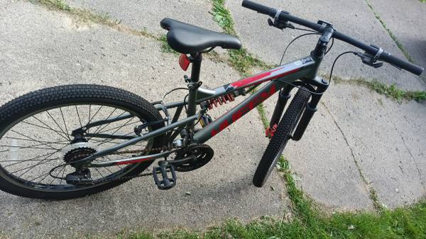 For sale like new few years old used once or twice, Huffy Marker Dual Full Suspension bike, 24", 21-speed, knobby tires, front disk brake and a quick release seat.