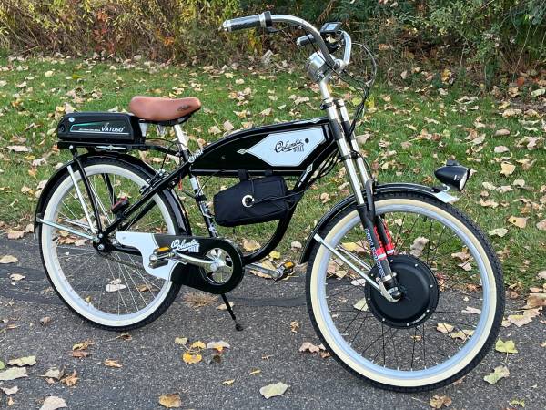 Columbia Reto-model 1937 this bicycle has a electric conversion 1000 watt front brushless motor, the battery is a 48volt rear mount with a key to remove battery the front fork is a dual shock motorcycle type fork, the bicycle has a rear coaster brake and a rear hand brake for safety. The bicycle and motor, and battery are new with only 7 test miles this is a heavy cruiser bicycle excellent for long rides