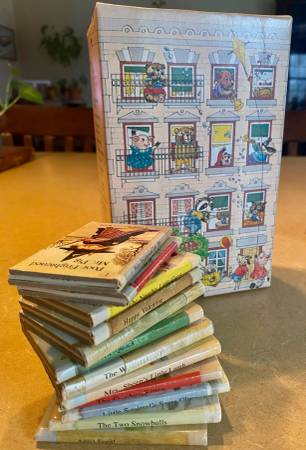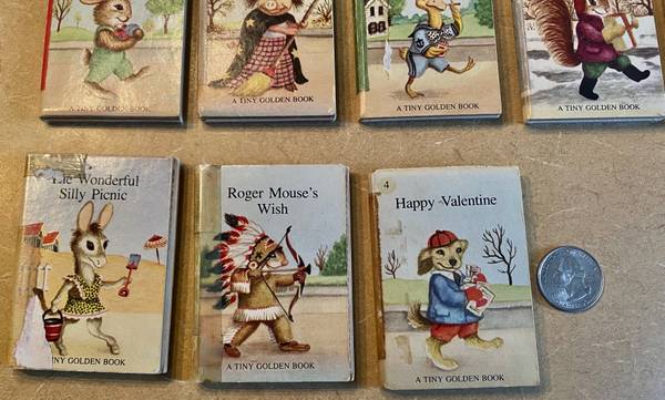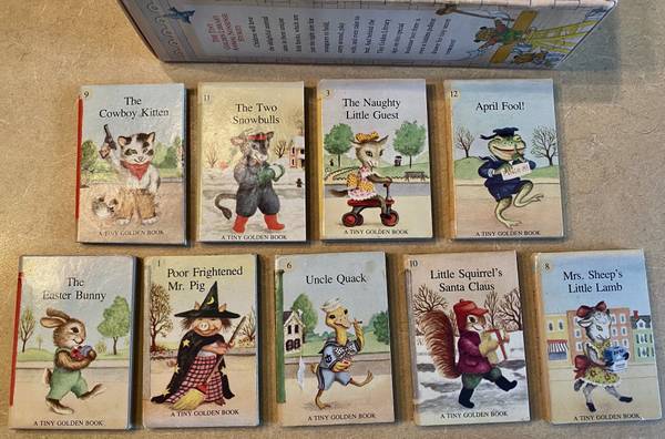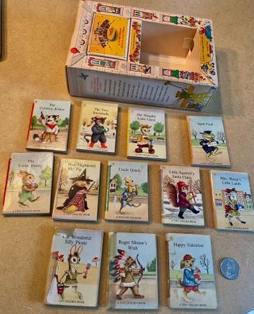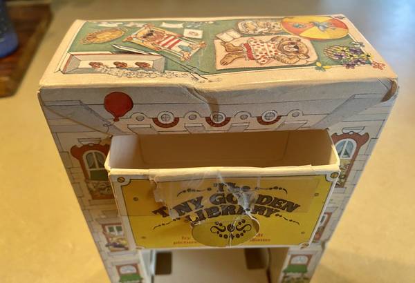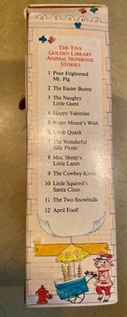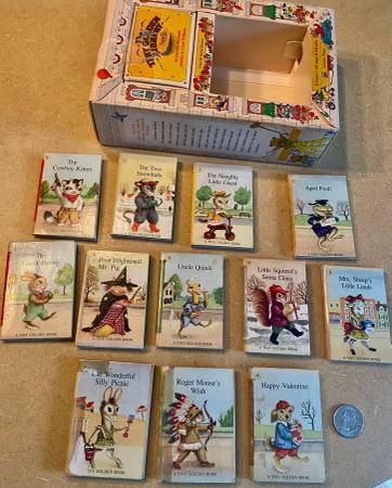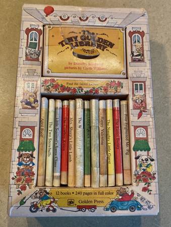 This is a used set of THE TINY GOLDEN LIBRARY books by Dorothy Kunhardt with pictures by Garth Williams. There are 12 miniature books and a hidden drawer. Condition is fair, tape on the box drawer and in the pictures the bottom row of the books with the quarter shows tape on 3 books. Please view the pictures. No tears inside the hardcover books pages.