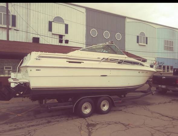 New engine put in 2021 though hours read 1200+. New tires for trailer (must be put on). New steering wheel needs assembly. 2 beds, kitchen, bathroom. New seats. Needs love. In pretty good shape but definitely needs some love. Have a solar panel set if you know someone who can install. 28ft, 10 1/2 beam. Lights installed under boat as well as as on the boat. A new switch is required to control lights. New radio and speakers, new seats. Sold as is.