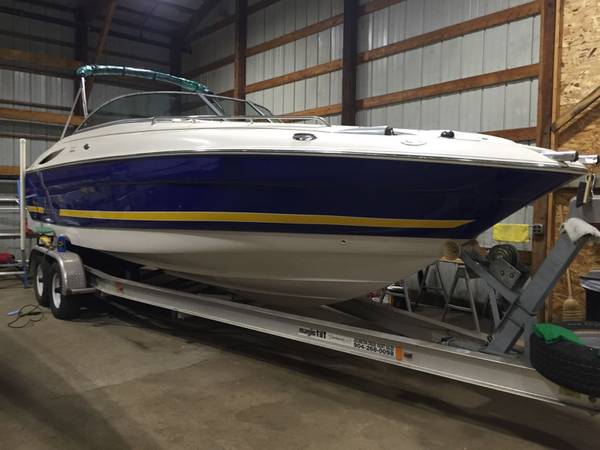 New snap-in cockpit carpet and new blue LED lights were added. It has a stereo with an iPhone plug-in, a small enclosed head with pump-out, and a freshwater tank with two sinks. Covers include a full mooring cover and a bow cover. A Bimini is also with it. The aluminum dual-axle trailer comes along.