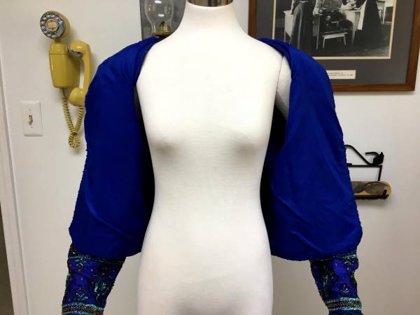 This is an absolutely gorgeous HEAVILY beaded jacket from the 1990's by "Della Roufogali". I bought this in the 90's and probably only wore it once. The outer shell is 100% silk. The inner lining is 100% polyester. It also includes a small bag of extra sequins and beads. It closes in the front with nine hooks & eyes. Tag says a size Large, which seems correct to me. Approximate measurements are (lying flat): Chest - 21", Neck to Hem - 19". It has large shoulder pads that can be easily removed if you prefer. It also has straps to help keep it on a hanger, but I've ALWAYS kept it flat in a box either in my closet or under my bed so it does not get stretched out. In excellent condition. I purchased this at Jacobson's on sale, but the original price was $220. I am asking $30
