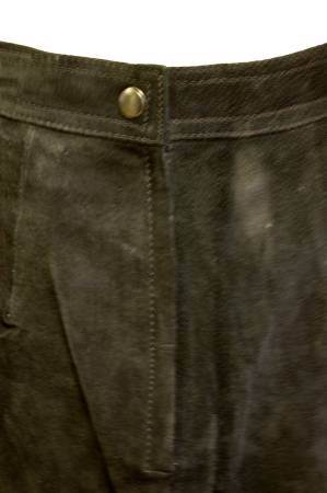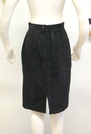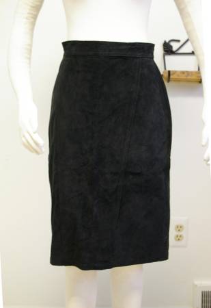 Black suede leather knee length skirt by "Winlit". The skirt is in fantastic shape. I see no damage other than it needs to be pressed (or whatever it is they do to leather). Has a zipper and a snap in the back. Size 9/10. Approximate measurements are 27" Waist and 25" Length (from the top). $10