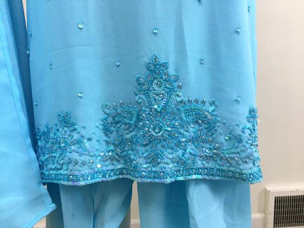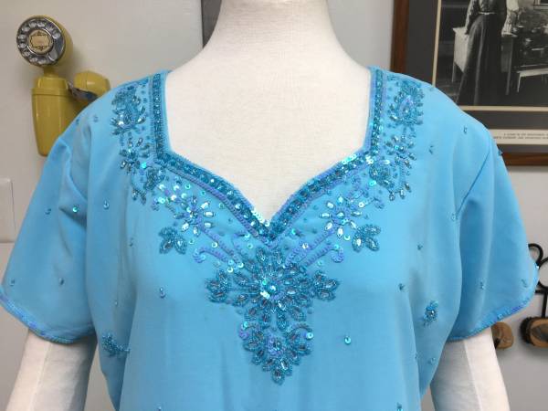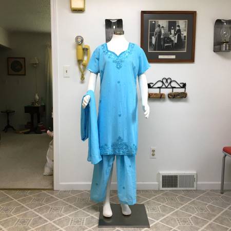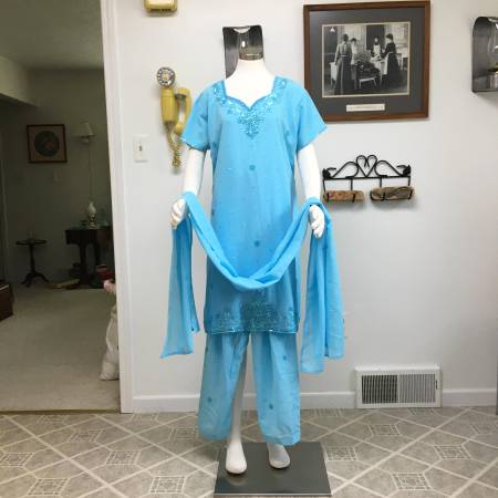 Blue Sequined and Beaded Indian 3-Piece Salwar - This lovely salwar includes the sequined and beaded top, drawstring pants and long scarf. In very good condition, but has been used so I think there are a few beads missing here and there. It is a size 46. This would also be good to wear for a Renaissance event.