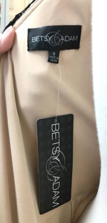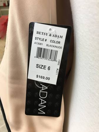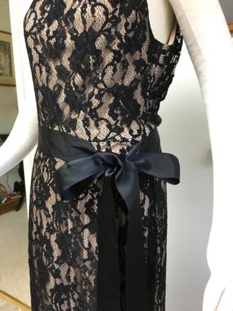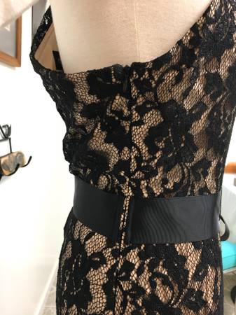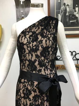 Ladies Black Lace with Nude Underlining One Shoulder Gown - This elegant dress has never been worn and is brand new with its tags. It is a single shoulder gown made of black lace over a nude underlining. It has a side zip and attached sash at the waist (attached under the arm at the zipper, but the rest is loose so you can tie it elsewhere than where I did). Made by Betsy & Adam and is a size 6.