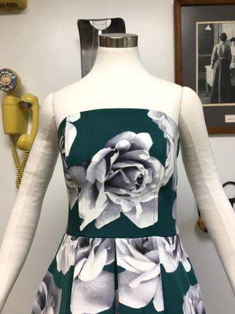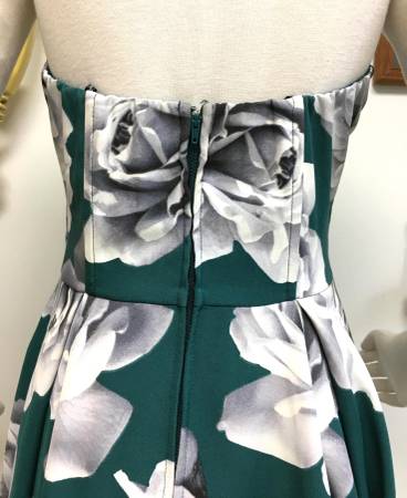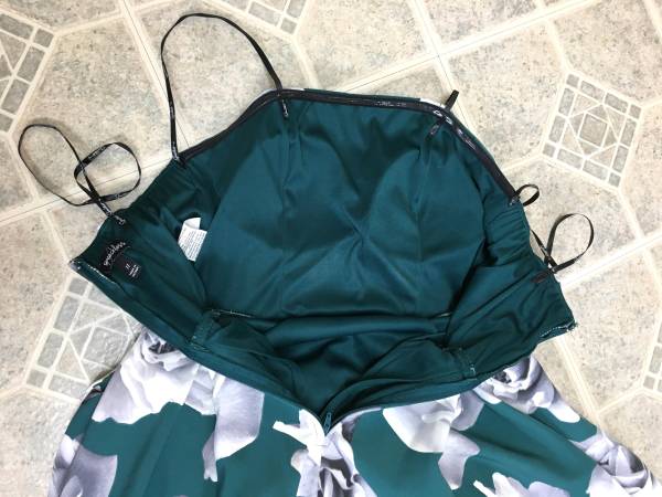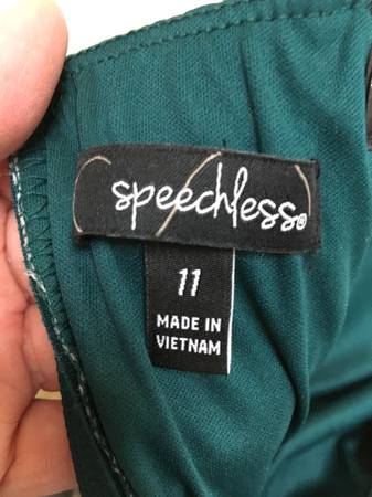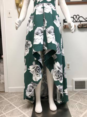 Ladies Green & White Strapless Hi-Lo Dress by "Speechless" - This dress is absolutely gorgeous! Well made with good material and construction. The fabric is white flowers on a green background. There are two layers of slips underneath with the innermost one having a row of tulle. The bodice is fully lined and has a rubber strip along the front edge to help it stay in place. There is also elastic along the top edge of the sides and back. On top of that, it's even machine washable! Made by "Speechless" and is a size 11.
