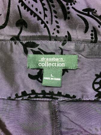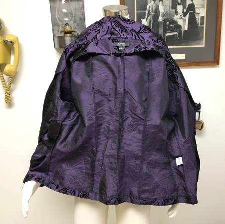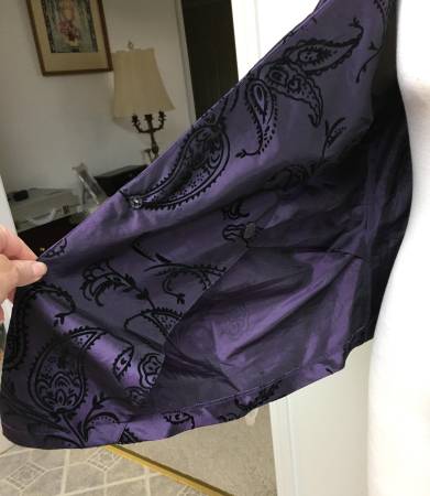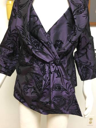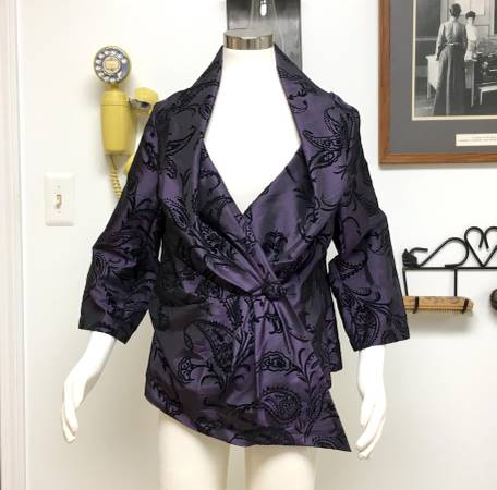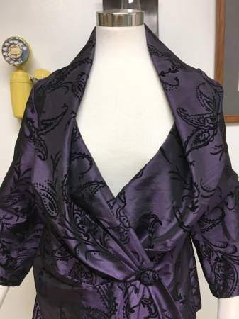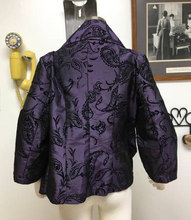 Ladies Purple & Black Paisley Taffeta Dress Blouse/Jacket/Blazer - This jacket could be used as either a cover for a dress or with a blouse/tank top and worn with a separate skirt or pant. It has 3/4 sleeves and is made of purple taffeta with black flocking in a paisley design. It is made by Dressbarn and is a size large, which seems accurate. Approximate measurements are bust 40" (does not include bust darts), waist 36" and sleeve length 18" from shoulder. This is a lovely jacket and will be perfect for just about any occasion.