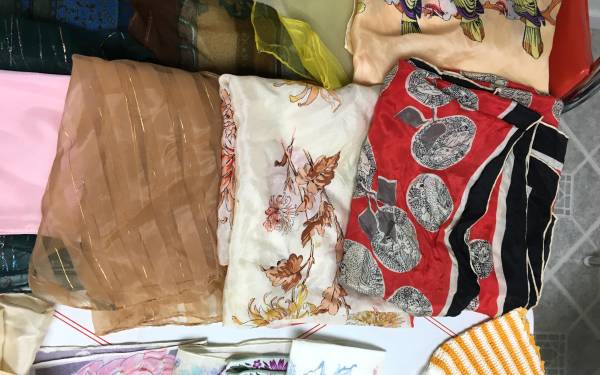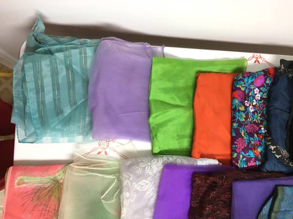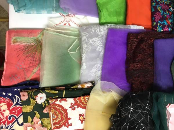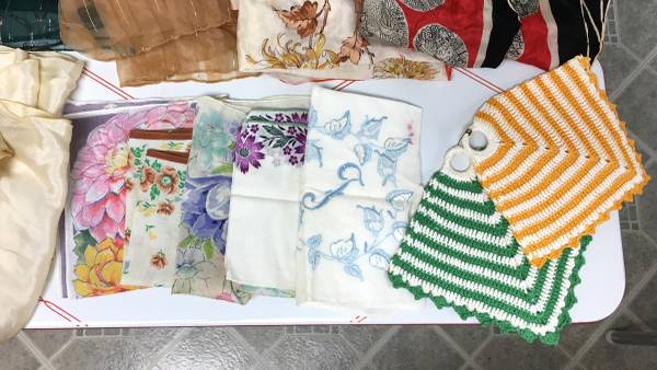 Lot of 33 Vintage Scarves, 5 Handkerchiefs and 2 Crocheted Hot Pads - This is a wonderful collection that has many sizes, designs and fabrics of the scarves. There are also five handkerchiefs and two lovely crocheted hot pads. The whole lot for $40.