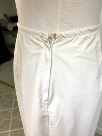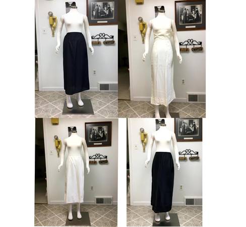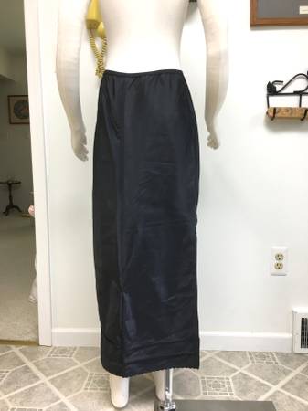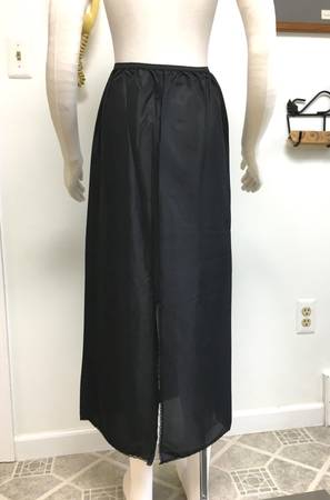Lot of Four (4) Vintage Women's Long Length Half Slips - All are used. Various sizes and condition. The two black slips have elastic waists. The two white ones zip up the side. The one that won't zip all the way (not damaged, just doesn't fit the mannequin) also has a wide elastic panel in the back. The other white slip has been hastily hemmed, but not in a permanent way. Just folded up with VERY long stitches so will be easy to remove. $20 for all four slips. Will not separate.