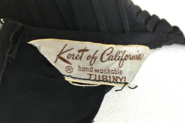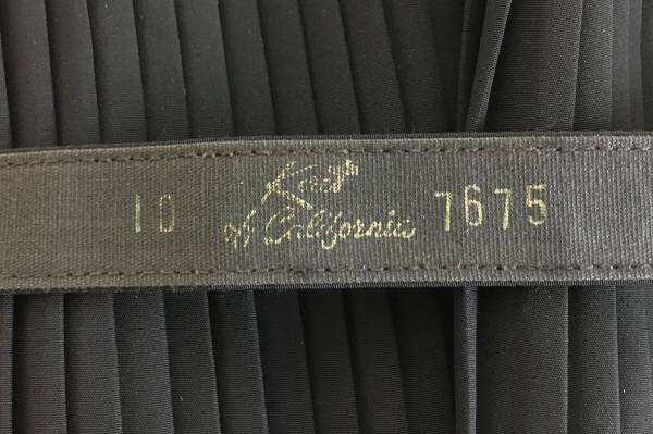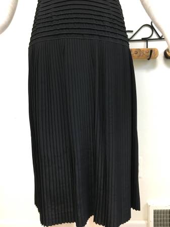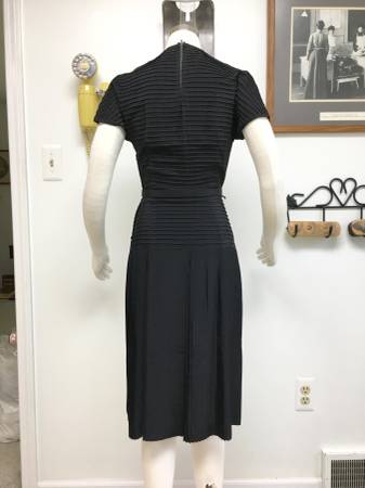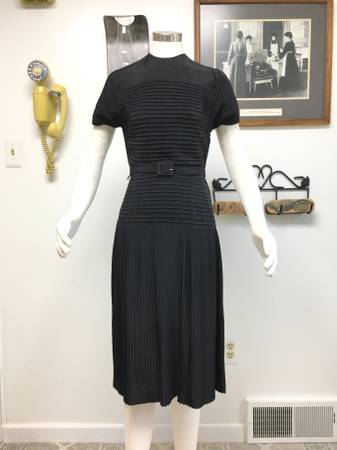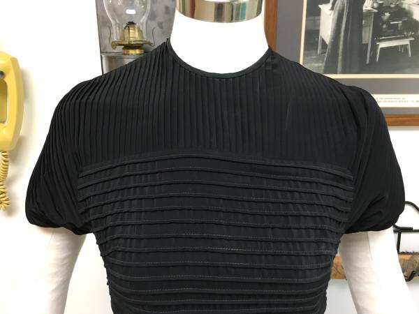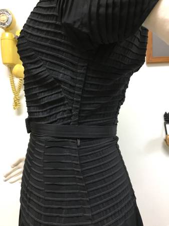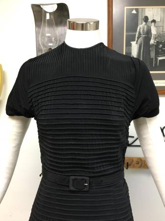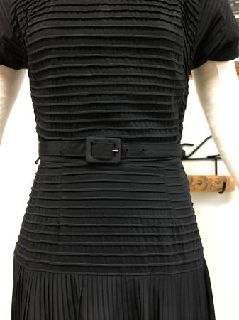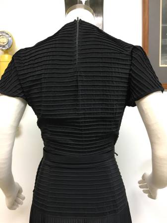 Vintage 1950's-1960's Black Pintucked & Pleated Cocktail Dress - This is a very lovely classic style dress that could still be worn today. Loads and loads of mini pintucking and pleats. The bodice has verticle pleats at the neckline, horizontal pintucks from bust to hips and a pleated skirt. The body is a nice form fitting dress to the hips. It has a thin buckled belt. It has a long side zipper and a short one at the back neckline. The bust is approximately 32" and the waist is 26". Length is approximately 43" from neckline to hem. Made by "Koret of California". There is no size tag, but I would guess this is an XSmall to Small. The back of the belt indicates it might be a vintage size 10.