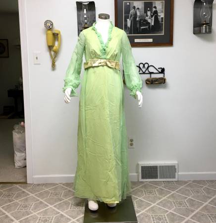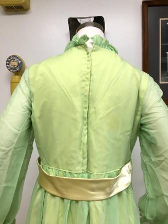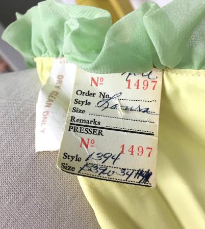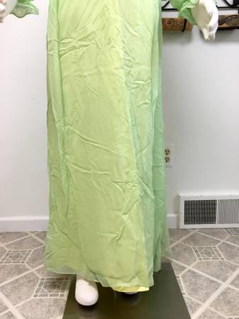 Vintage 1950's-1960's Lime Green & Yellow Long Bridesmaid/Evening Gown - This is a realy cool vintage dress that has a lime green crepe chiffon overlay with a yellow taffeta lining. It has a wide yellow satin belt that has the right side attached to the front, then the belt goes around and you snap it to the other side of the bow. It closes in the back with a nylon zipper and hook. I don't think this dress was ever used as it still has the cardboard style tag attached to the inside. The tag says it has a 39" bust and 34" waist. I measure the waist at 31", but I was trying to be conservative so it could be larger. I would say this is a size medium. It is approximately 56" long from shoulder to hem. I didn't press it because I thought that should happen after it's been cleaned first.