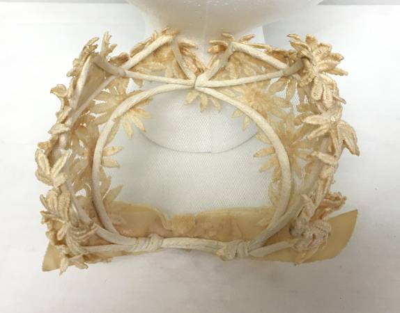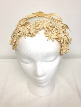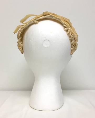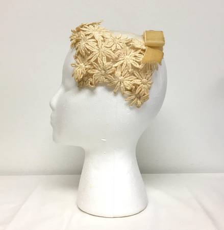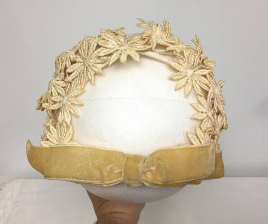 Vintage 1950's-1960's Ladies Ivory/Champagne Color Flower Applique Hat - An ivory or champagne colored applique flowered hat with a velveteen ribbon on the back. In very good condition. No label inside.