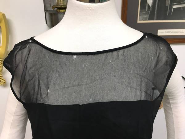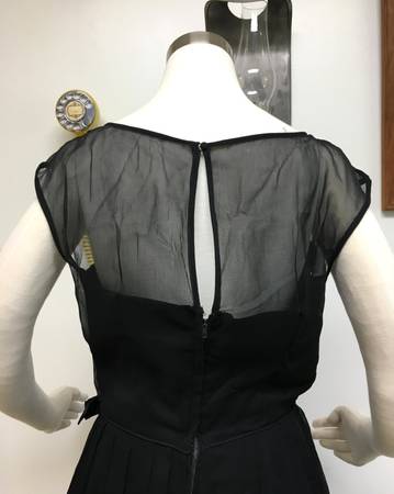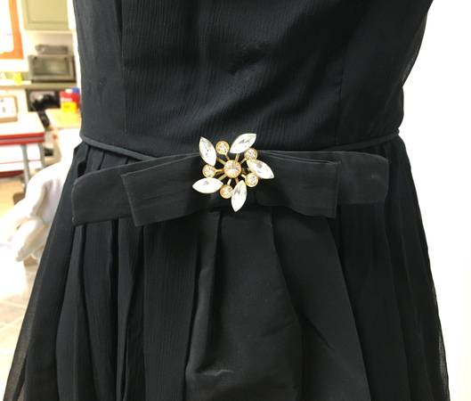 Vintage 1950's "Elinor Gay Original" Black Taffeta & Chiffon Cocktail/Evening Dress - This is a classic "Little Black Dress". It has a crepe chiffon overlay with a deep taffeta trim on the bottom and left side. The left side piece is topped with a taffeta bow and rhinestone pin (no missing rhinestones). It has a black lining and net petticoat for fullness. It closes in the back with a metal zipper and button at the neck. This seems to be a larger size because there is a tag on the petticoat that reads "Size 16". It still has a small waist, but allows for a larger bust. I was going to put this up for $50, but decided on $30 instead because I do see some small holes in the chiffon in the bust area.