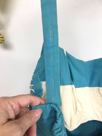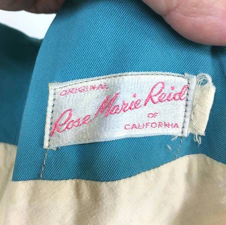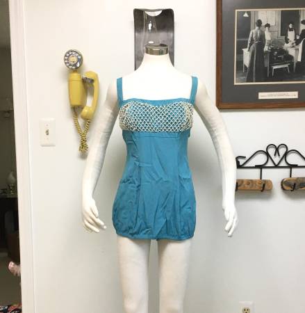 Vintage 1950's Ladies/Women's Pin-up Swimsuit by "Rose Marie Reid" - This is a beautiful blue swimsuit that is still in good enough condition to wear today. Especially if you do vintage clothing, rockabilly or pin-up photos. It has a lovely white front trim that reminds me of waves of seashells so would make a neat mermaid-style suit. Designed by "Rose Marie Reid of California". This is a superbly made bathing suit. The bust is lined and boned. It has a very strong metal zipper in the back, which is also backed with a flap and hooks/eyes. The shoulder straps have four different buttonholes for sizing. The back and leg openings have elastic which is still pliable. The size tag is too worn to read, but the 'approximate' measurements are below. Remember to leave a small amount of room for error and for ease when wearing. Also, I have not cleaned the suit and have left for the new owner to do in a manner they prefer.